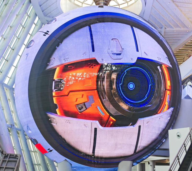 球幕显示屏总面积超过2500平方米,分辨率超过6K,采用透明显示技术,具有超轻超薄、高通透、高亮的特点,完美适配各种商业显示、科技馆、展览馆等展览展示空间。此外,透明屏较常规裸眼3D显示产品具有更加轻薄的优势,全面满足现场安装条件。