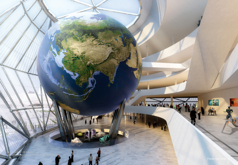 从场馆外可同时观看到馆内中庭的地球LED屏幕和屋顶球形天文台,感受地月同在的宇宙景观。